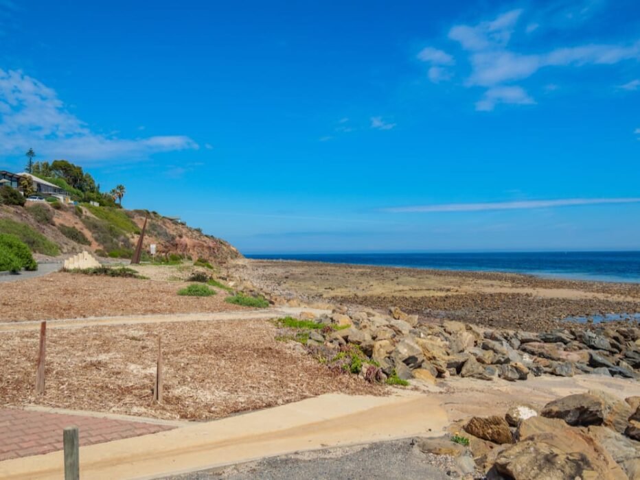 There is a pebble-strewn flat rock platform in the tidal zone, and an interesting cliff face, as well as beach and reserve views
